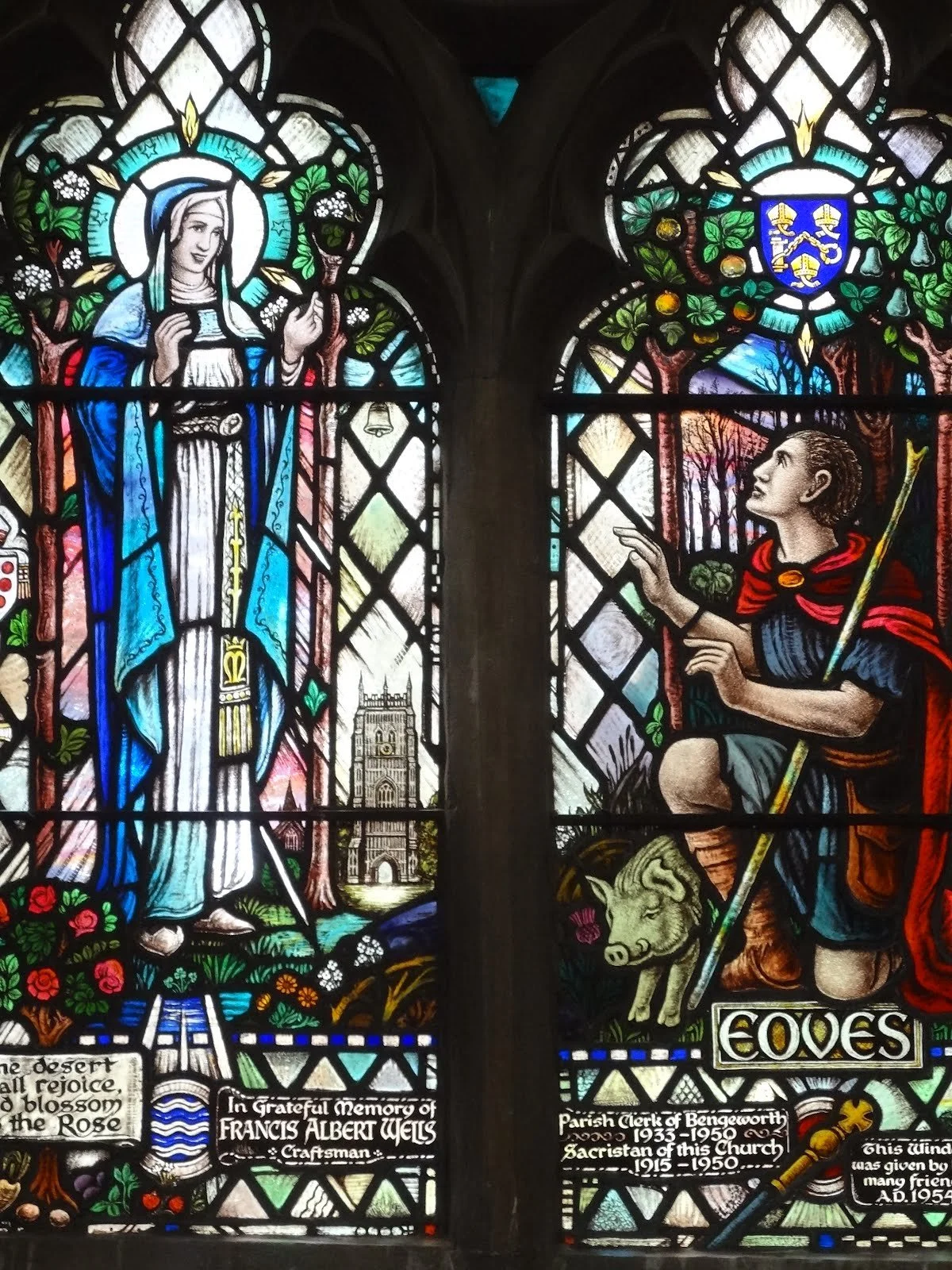 St Weonard (Wannarth) was a local woodcutter turned hermit who was a follower of St Dubricius, he became archbishop of Caerleon who crowned King Arthur there in c518. A stained-glass window depicts St Weonard, with a long beard, holding a bible in one hand and a woodcutter's axe in the other, and the words 'Wenardus Heremita'.